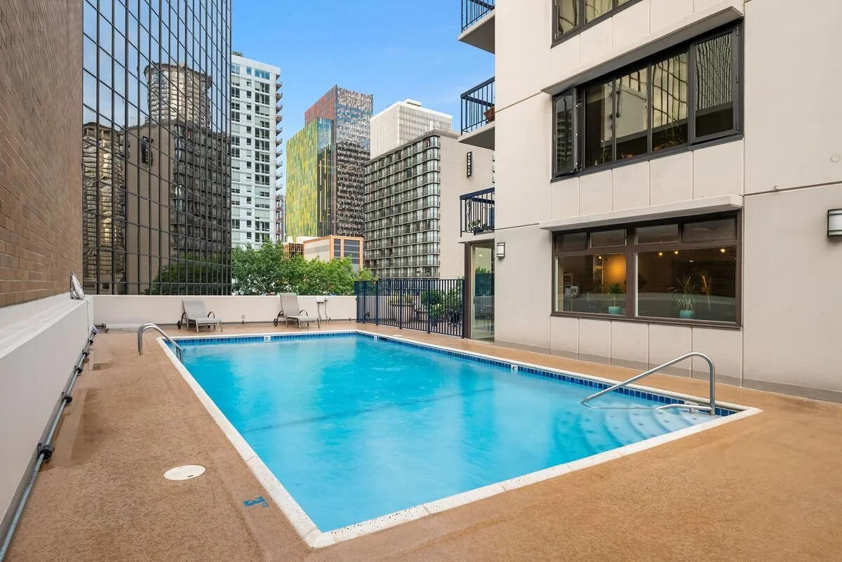 Enjoy hi-rise living on the sunny SW corner of the 22nd floor of this solid concrete and steel building featuring all new windows, rooftop deck with BBQ's, outdoor pool, club room and exercise center. Open living/dining with lovely covered balcony, newer appliances, walk-in closet in master, blackout shades. Well run HOA has low dues. Secure parking, extra storage. No rental cap. This is a tremendous value!
